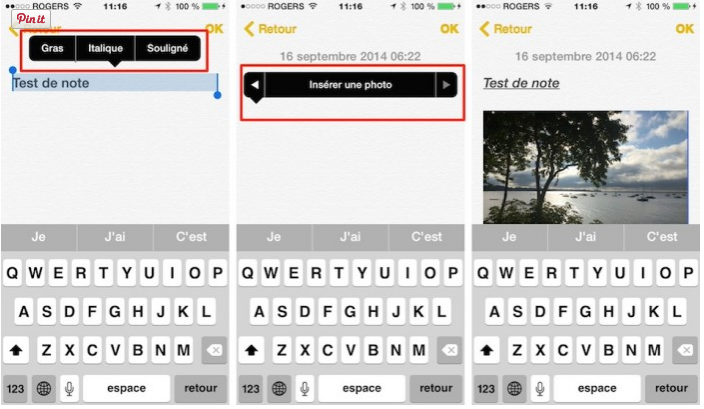 L’application Notes offre des options de formatages de texte et la possibilité d’insérer des photos dans une note. Trois options de formatage y ont été ajoutées. Vous pouvez appliquer le caractère gras, italique et souligné à un mot ou une phrase. De plus, il est possible d’intégrer une ou plusieurs photos à l’intérieur d’une note.