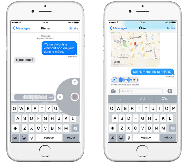 Avec la nouvelle version de Messages, les sons alimentent la conversation. Faites-vous entendre en enregistrant votre voix, une chanson ou un fou rire qui en dit long. Touchez simplement le bouton du microphone pour la durée de votre clip audio, puis balayez l’écran pour l’envoyer.