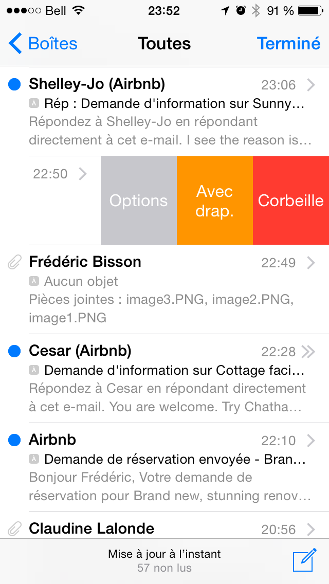 En glissant votre doigt vers la gauche, vous pourrez (comme avant) supprimer le courrier, mais aussi faire plus: le sélectionner comme courrier indésirable, le faire suivre, le sauvegarder, etc. Pratique! On aime!