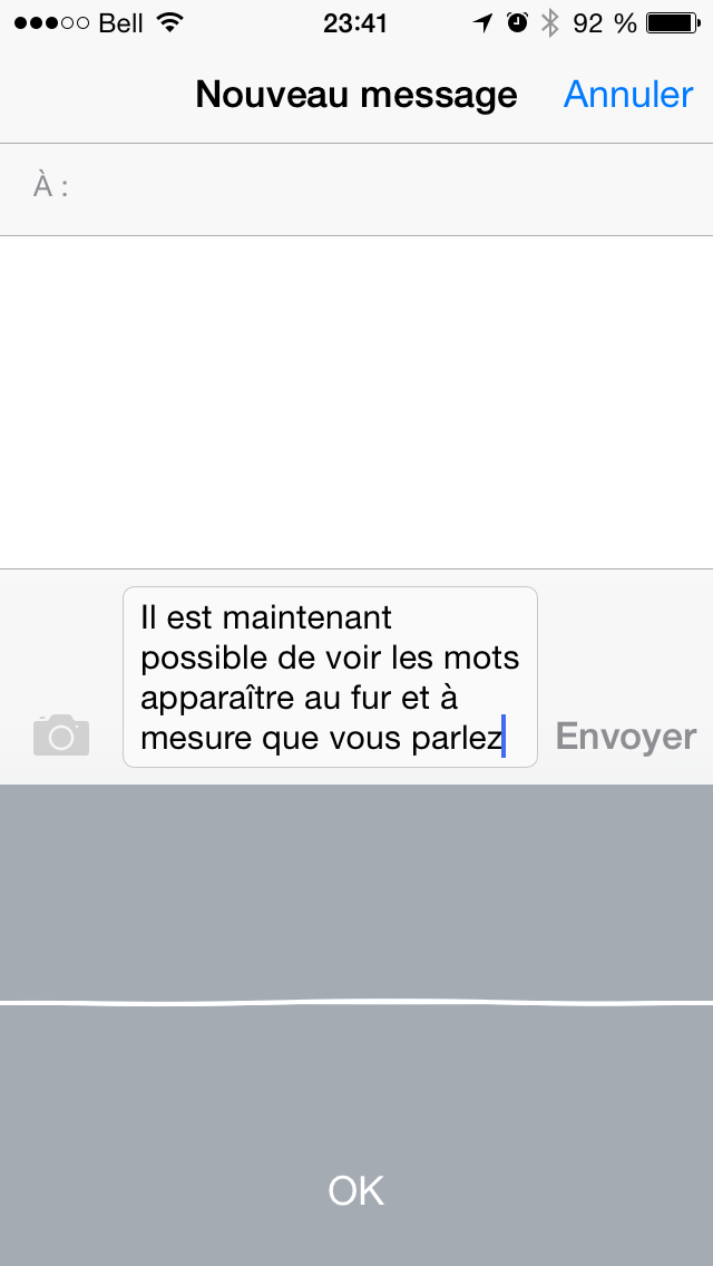 Nouveauté très attendue: la dictée de mots en temps réel. Plus besoin d’attendre à la fin de la dictée pour voir si votre appareil vous a compris. Les mots s’inscrivent au fur et à mesure. Il est fascinant de voir iOS8 corriger, effacer, réécrire vos mots, au fur et à mesure de sa compréhension de votre texte. Prodigieux!